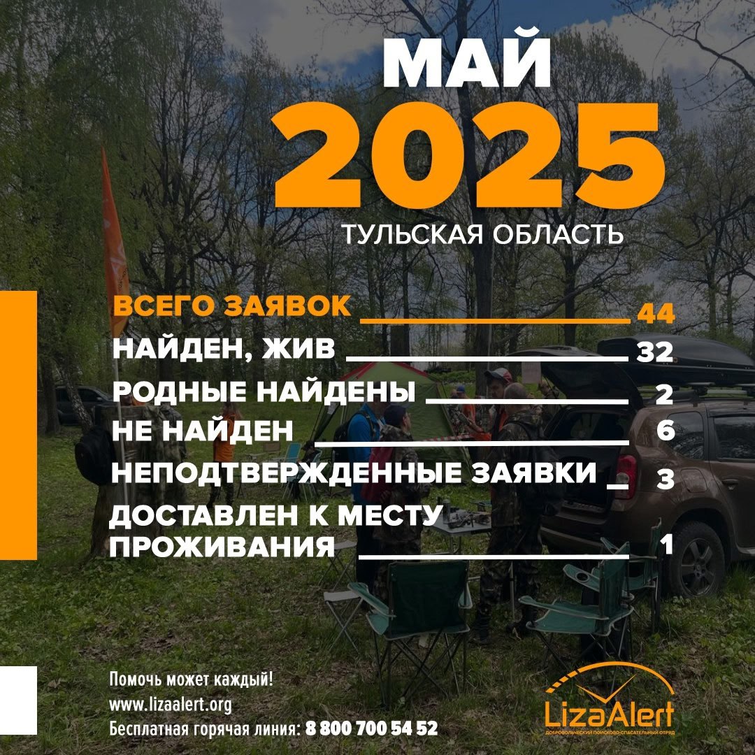 Поисковый отряд «ЛизаАлерт» в Тульской области подвел итоги работы за май. Всего к ним поступило 44 заявки на поиск пропавших. Живыми удалось найти 32 человека.