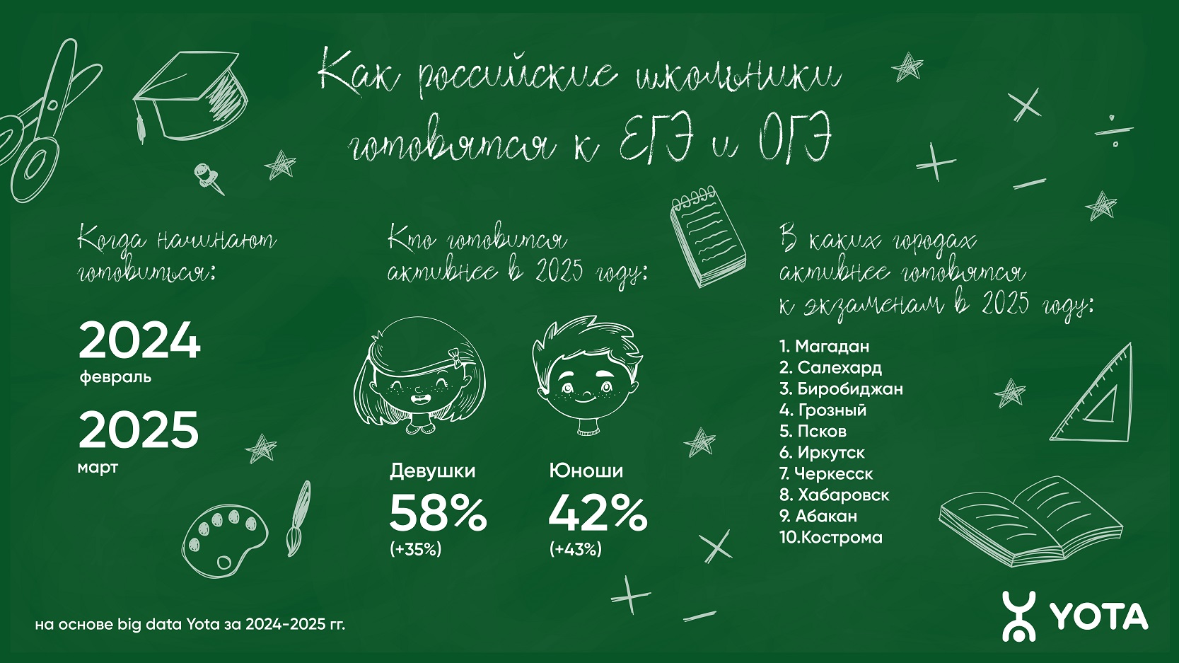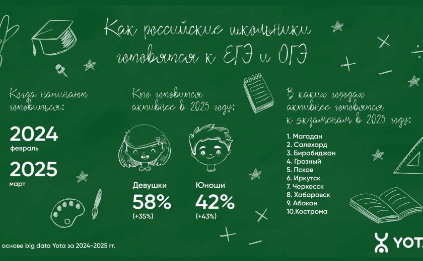 Как показал анализ активности на образовательных сайтах для подготовки к экзаменам с 2023-го по 2025 год, летом российские школьники практически не вспоминают об экзаменах — в июле и августе традиционно наблюдается резкое снижение числа пользователей тематических ресурсов. Пик активного обучения приходится на сентябрь, когда ученики возвращаются с каникул, однако показатель идет на спад в осенние и зимние месяцы. В 2024 году школьники начали уделять время подготовке к экзаменам в феврале, а в 2025-м старт активности сдвинулся уже на март. При этом начало сезона подготовки к экзаменам не зависит от пола: и девушки, и юноши задумываются об учебе в одно и то же время.