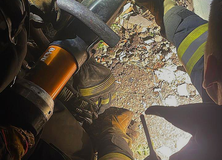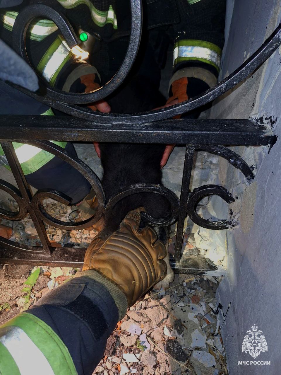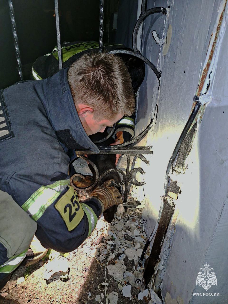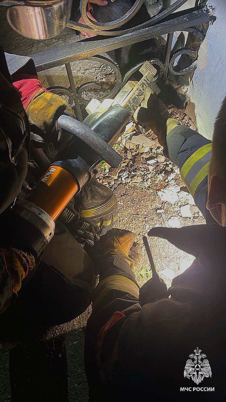 Неравнодушные местные жители вызвали на место спасателей. Сотрудники 25-й ПСЧ выехали на место и с помощью гидравлического аварийно-спасательного инструмента вызволили собаку. Четвероногий не пострадал.