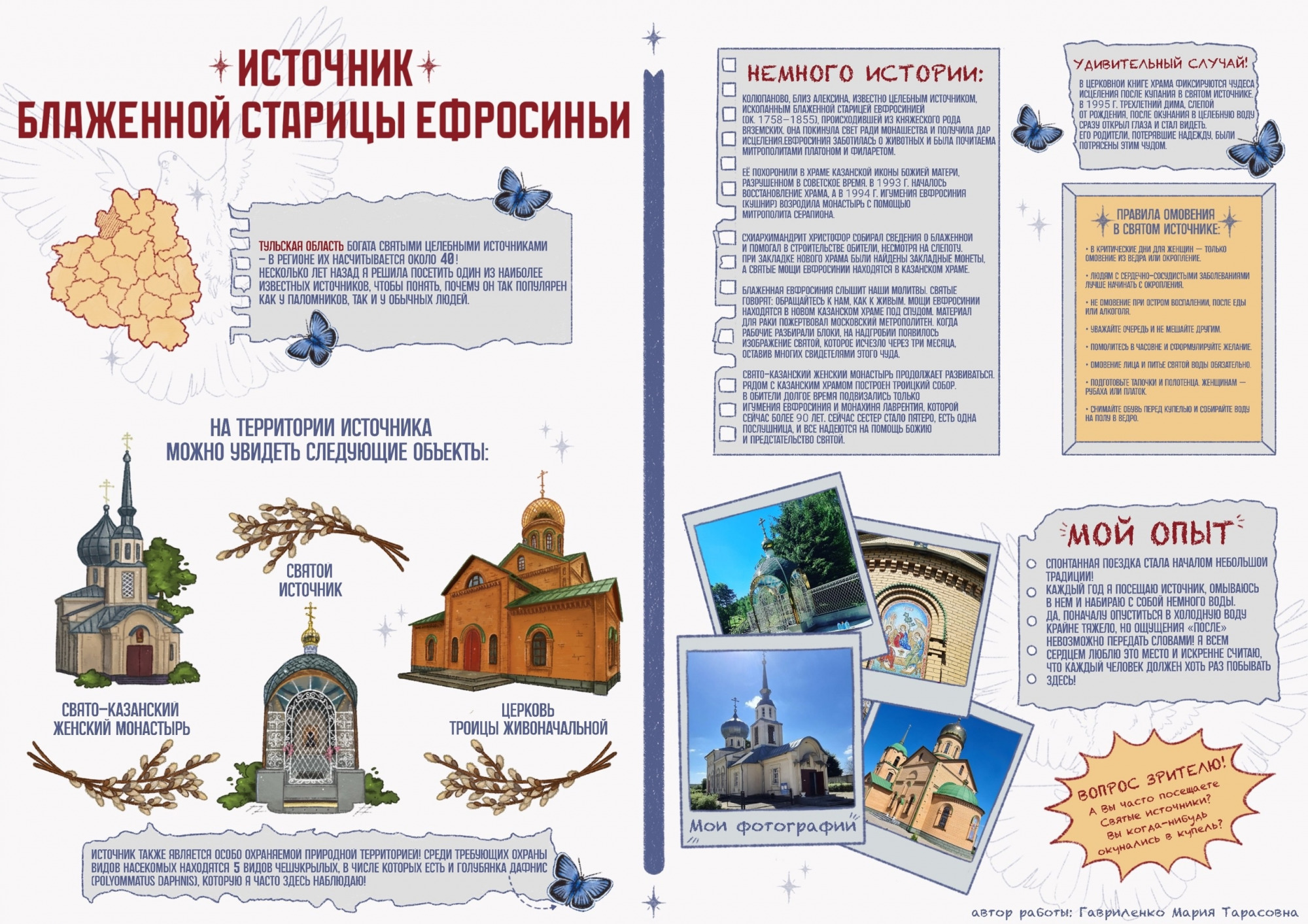 В числе победителей — тулячка Мария Гавриленко. Студентка первого курса факультета рекламы и связей с общественностью РГГУ стала первой в номинации «Текстовая страница — презентация» в четвертой возрастной категории (от 15 лет). В ней девушка рассказала о Туле, изобразив Святой источник в деревне Колюраново. Детали отрисовала сама Мария, в своей работе она использовала синий, красный и золотой цвета. Они были выбраны неслучайно.