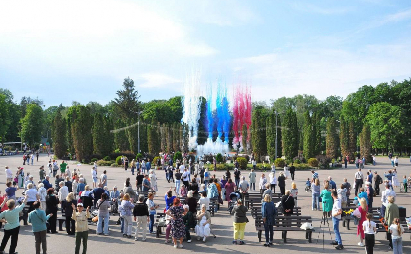 Ярким финалом праздничной программы стал залп цветного дыма на фонтанной площади парка. Он был в цветах российского флага.