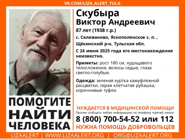 Поисковый отряд «ЛизаАлерт» разыскивает 87-летнего Виктора Андреевича Скубыру из села Селиваново Щекинского района. Пенсионер пропал накануне, и его местонахождение неизвестно.