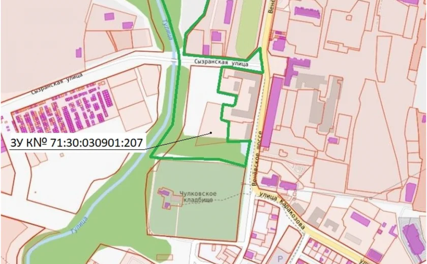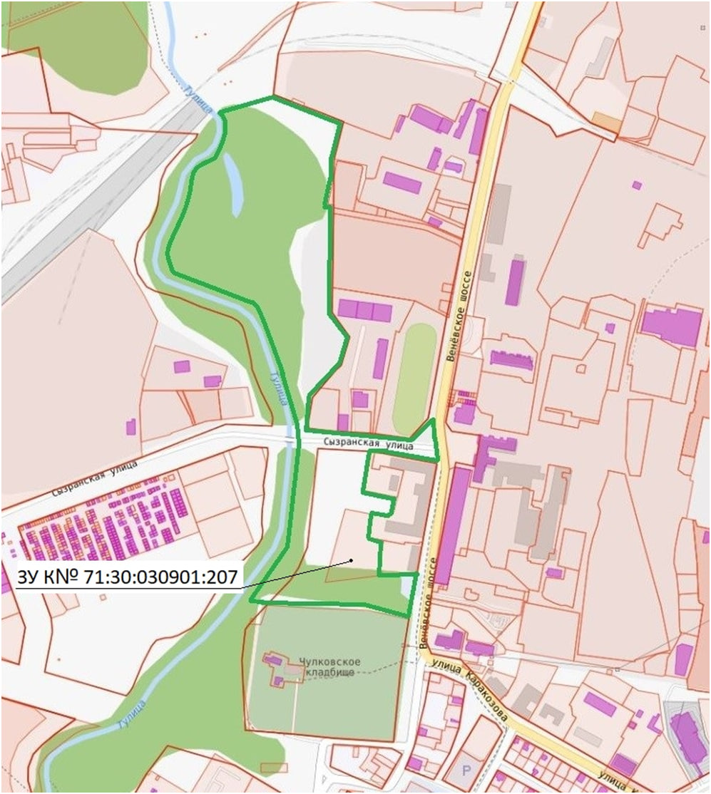 Участок по Веневскому шоссе и Сызранской улице расположен рядом с кладбищем. Он тоже не застроен. Комплексному развитию подлежит площадь в 152 812,35 кв. м, а жилой застройке — 76 000 кв. м.