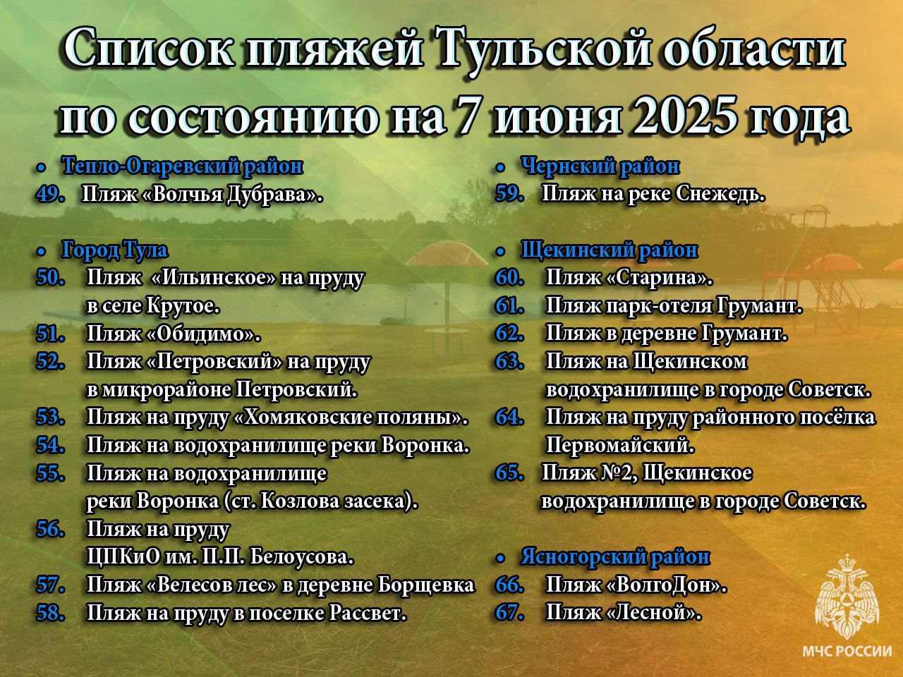 В Тульской области обновили список официальных пляжей. По данным регионального управления МЧС на 7 июня, всего оборудовано 67 зон для безопасного отдыха на воде. В том числе девять из них находятся в Туле.