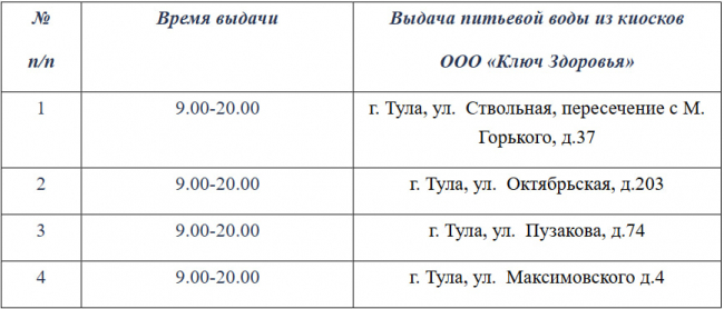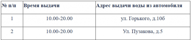 Также будет организована бесплатная подача воды — технической и питьевой. Адреса — в таблицах ниже: