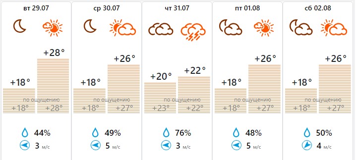 Пик зноя в Центральной России ожидается именно в конце июля. Средние температуры составят +30…+31 градус днем. В начале августа столбики термометров немного опустятся — до +27…+29 градусов. Также можно ожидать грозовые дожди.