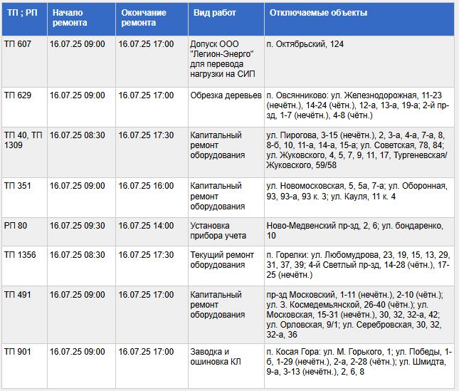 Без света останутся жители нескольких микрорайонов. Отключения коснутся домов по улицам Пирогова, Советской, Жуковского и Тургеневской. Кроме того, электричества не будет в Горелках, поселках Овсянниково, Косая Гора и Октябрьском.