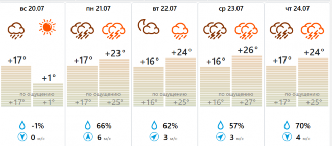 Наиболее интенсивные осадки пройдут в первую половину семидневки. Из-за постоянных гроз воздух не сможет прогреться, столбики термометров поднимутся только до +21…+26 градусов.