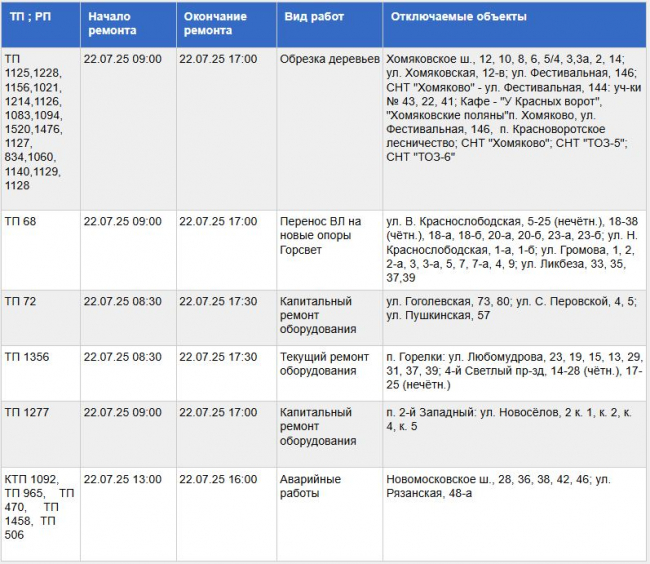 Список прочих отключений и адресов указаны в таблице: