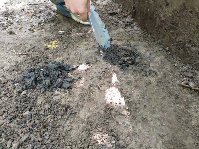 В прошлом году археологи обнаружили здесь культурный слой, в котором находились угольки истлевшего дерева — после на этом участке разбили раскоп. Угольки, растворившиеся в почве, — это следы несущих конструкций деревянной постройки. Она была небольшой, удлиненной, стояла у кольцевого рукотворного вала — это характерно для периода раннего железного века. За неимением хороших топоров строили ее следующим образом: по периметру вкапывали столбы и между ними укладывали более тонкие бревна. Печей тогда не было — в постройке горел очаг.