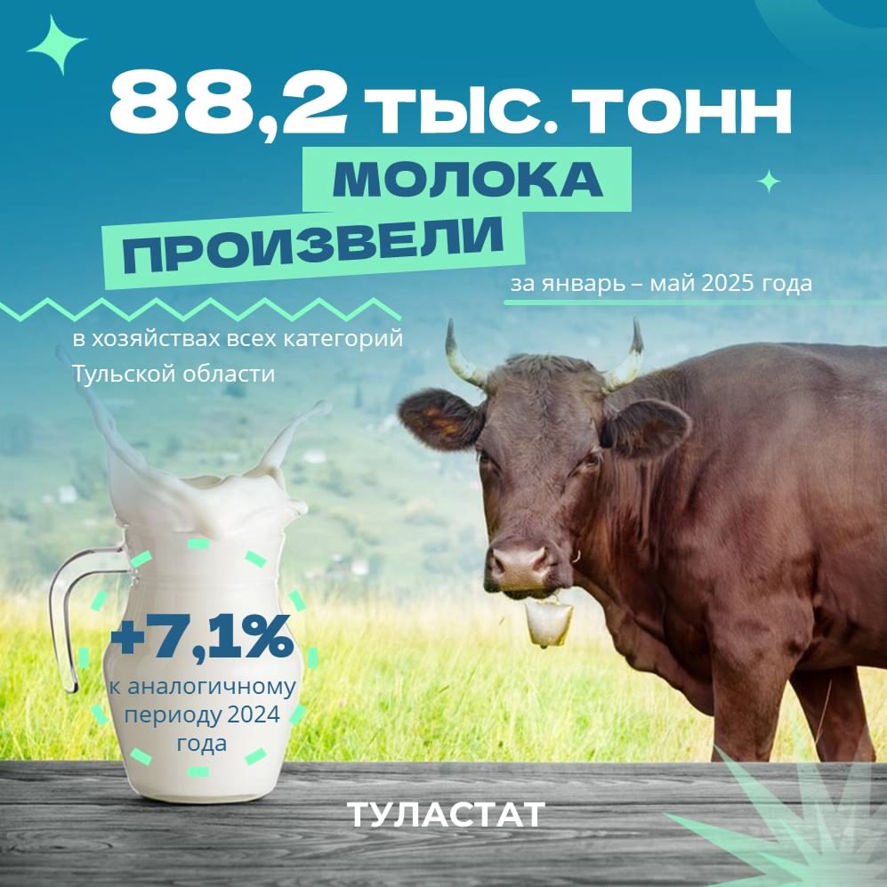 Это на 7,1% больше, чем за аналогичный период 2024 года. Отметим, что, по данным на 14 июля, средняя цена за литр пастеризованного молока 2,5–3,2% жирности в Тульской области составляет 89,66 рубля.
