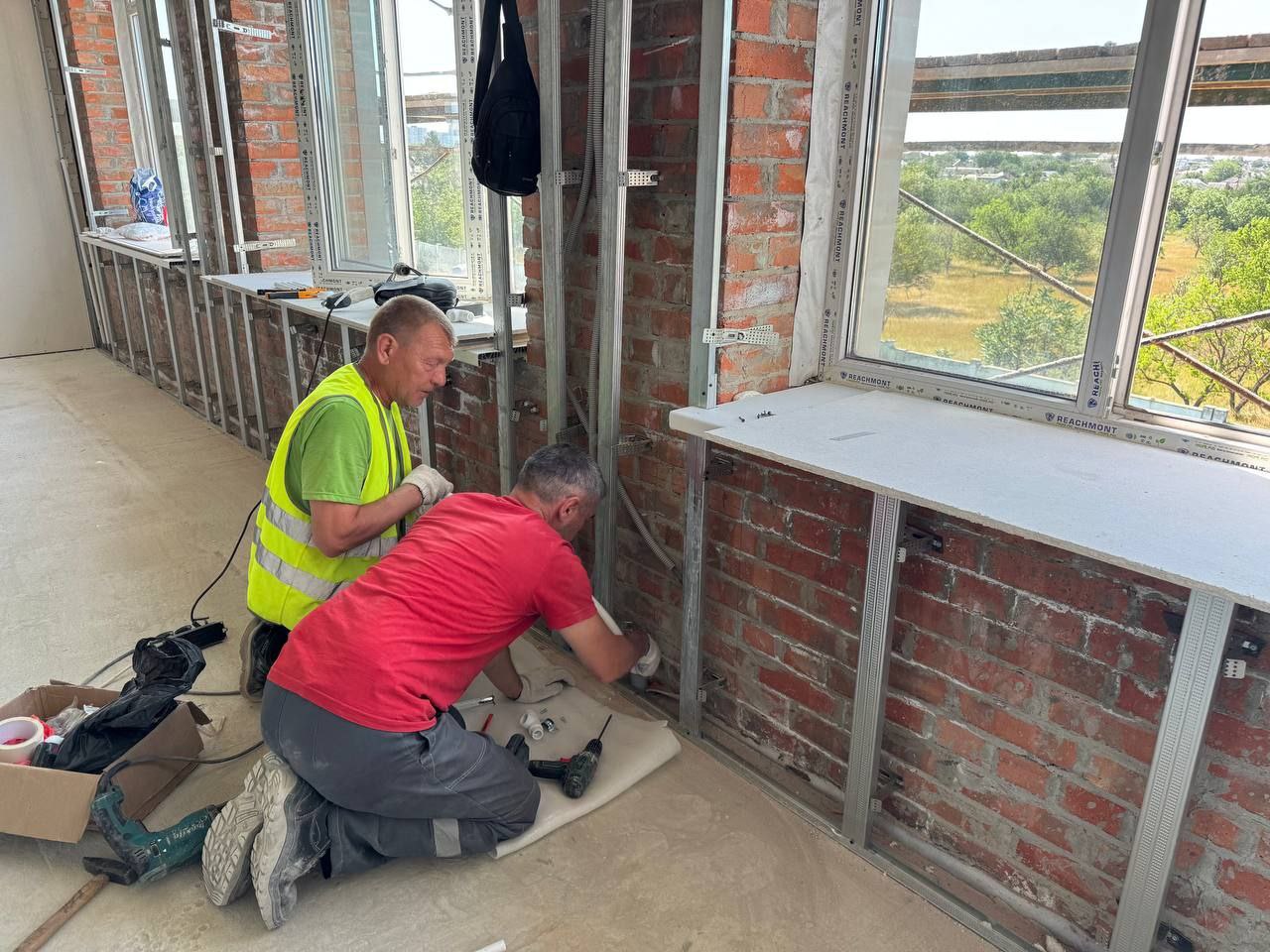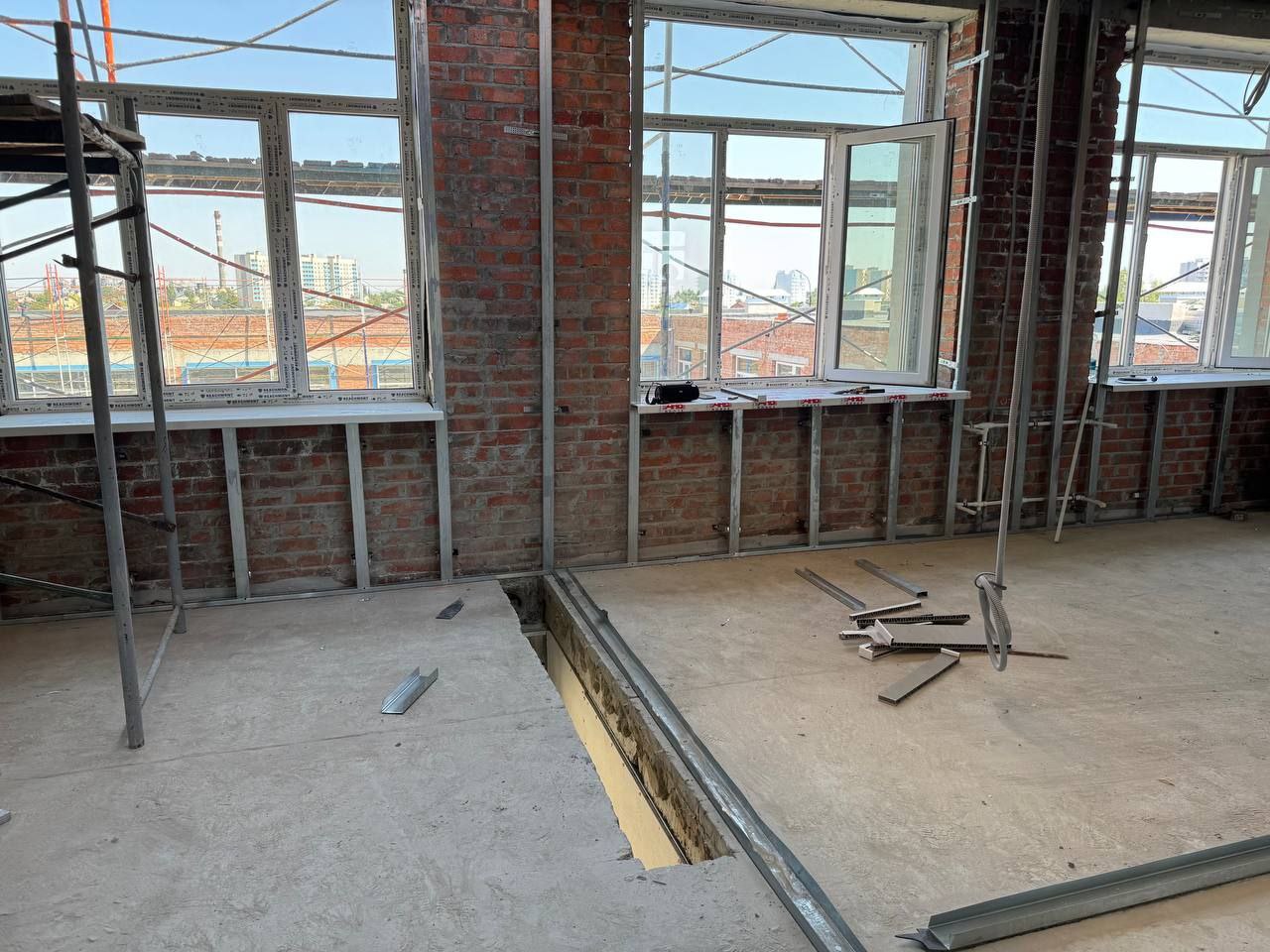На данный момент уже полностью восстановлен конструктив здания, выполнена разводка наружных сетей водоснабжения и канализации, усилены оконные и дверные проемы.