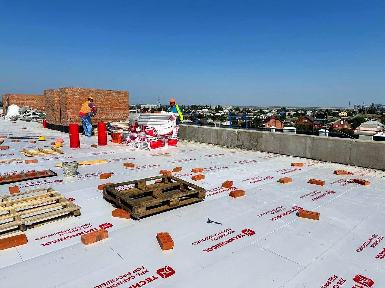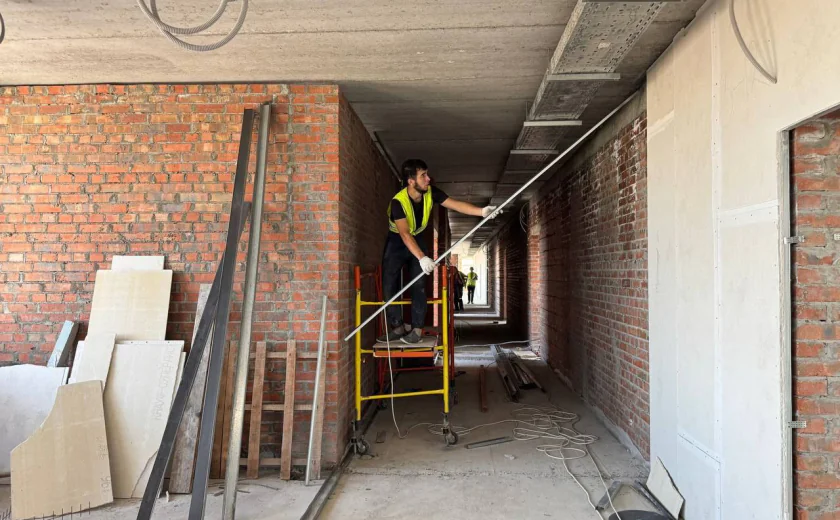 Сейчас строители обустраивают внутренние перегородки, разводку внутренних инженерных сетей и занимаются черновой отделкой. Кроме этого, ведутся работы по устройству пирога кровли трехэтажной части образовательного учреждения.