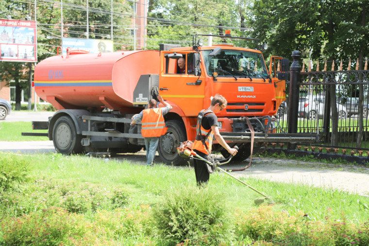 Сегодня специалисты подрядной организации трудились у памятника моряку-герою В. Ф. Рудневу. Они пропалывали цветники, вносили удобрения, косили газон и подстригали многолетние кустарники. Особое внимание уделяется поливу: чтобы земля не пересыхала и растения не увядали, каждый клочок зеленых насаждений орошается дважды в день.