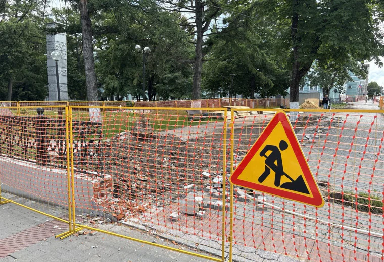 Подрядчик начал ремонт 23 июня. В данный момент идет демонтаж старых конструкций. Далее начнут монтаж металлической надписи, а также укладку бетона для обновления входной группы и подпорной стены вдоль проспекта Ленина.