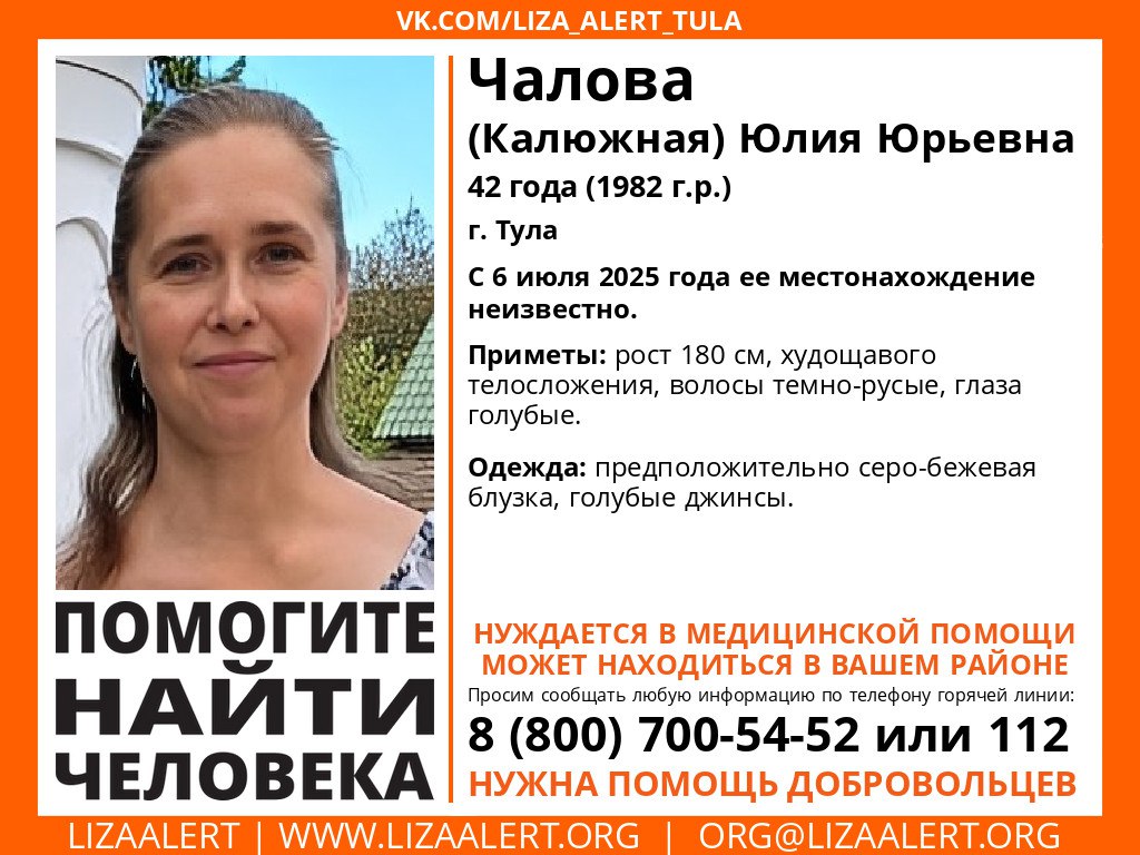 В Туле уже два дня разыскивают 42-летнюю Юлию Чалову (Калюжную). По данным поискового отряда «ЛизаАлерт», местонахождение женщины неизвестно с 6 июля. При этом она нуждается в медпомощи.