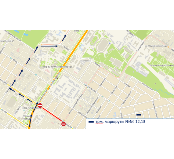 В это время трамваи маршрутов № 12 и 13 будут следовать по измененной схеме — через улицу Фридриха Энгельса. Остановки в районе ремонта временно не обслуживаются.