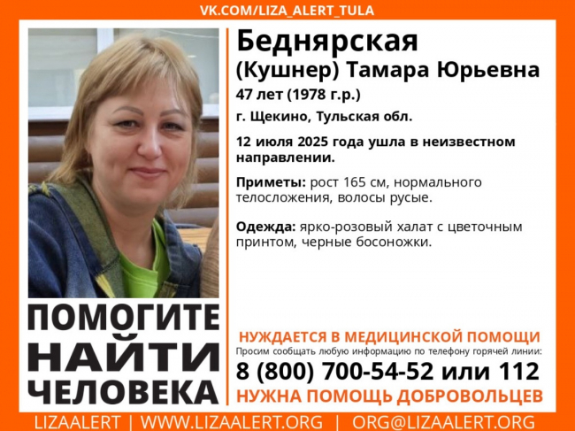 Поисковый отряд «ЛизаАлерт» разыскивает 47-летнюю Тамару Юрьевну Беднярскую (Кушнер) из Щекина. Женщина пропала сегодня — ее местонахождение неизвестно. Волонтеры предупреждают: Тамара Юрьевна нуждается в медицинской помощи.