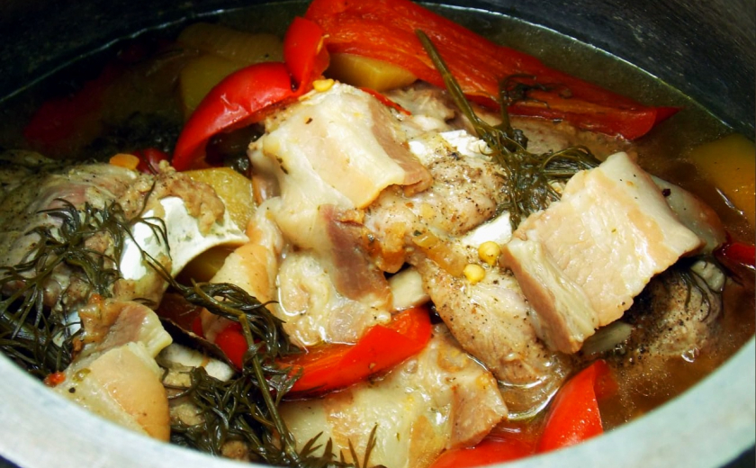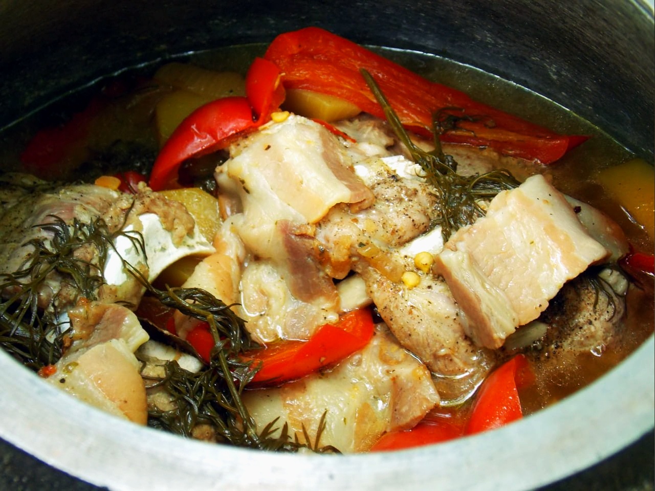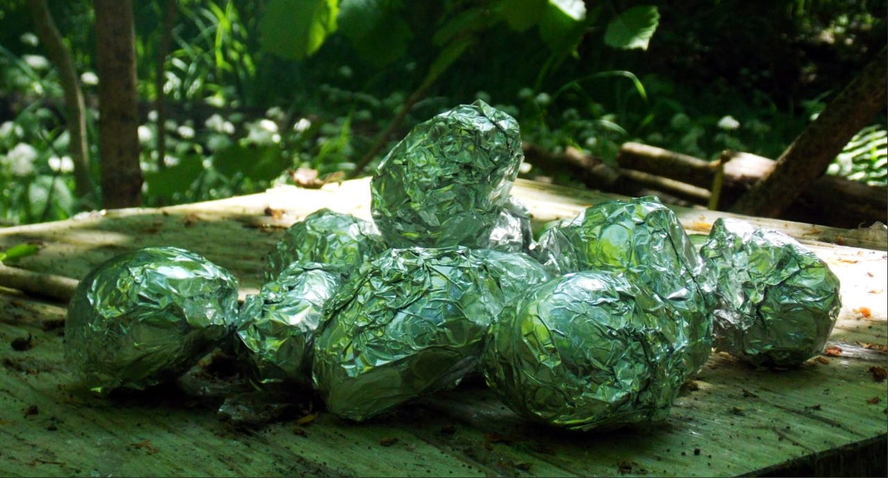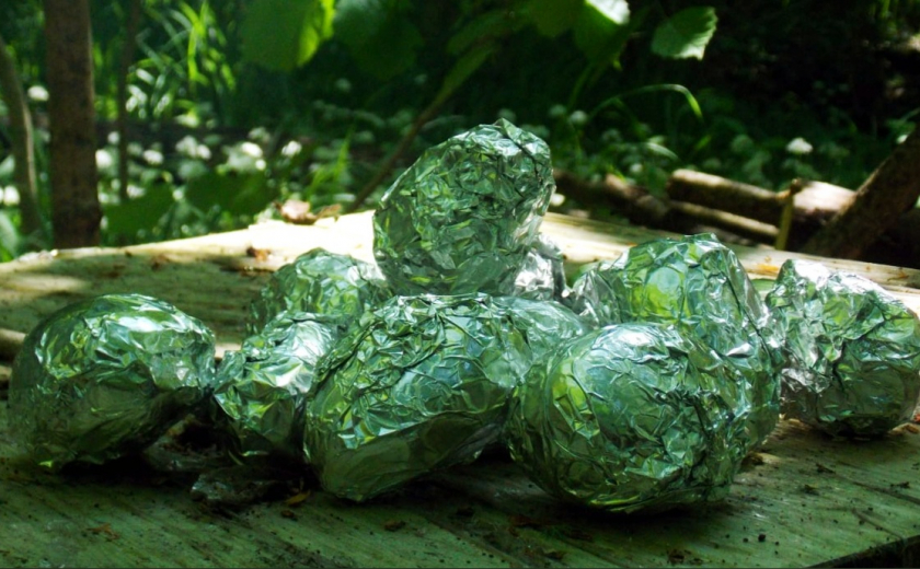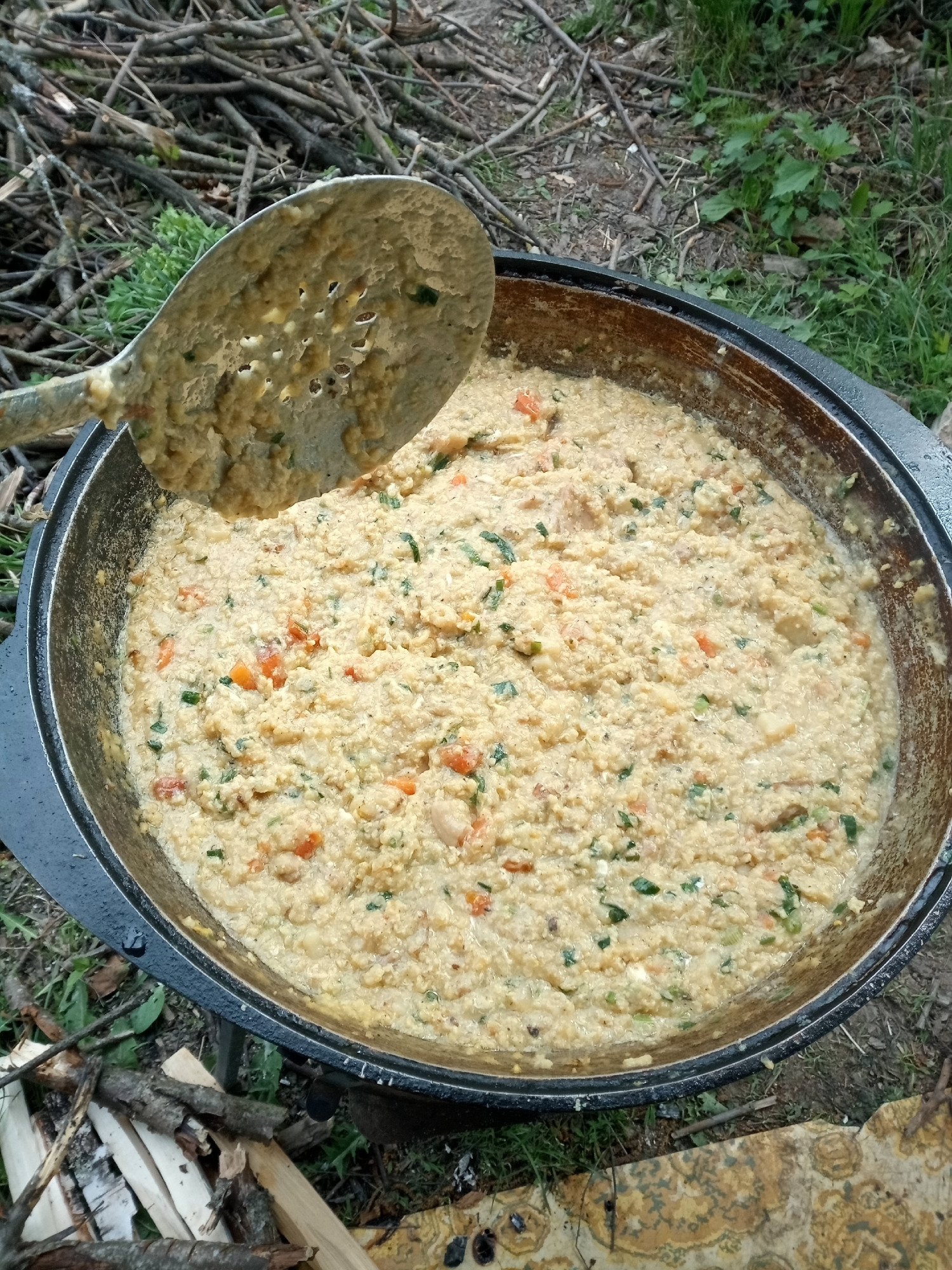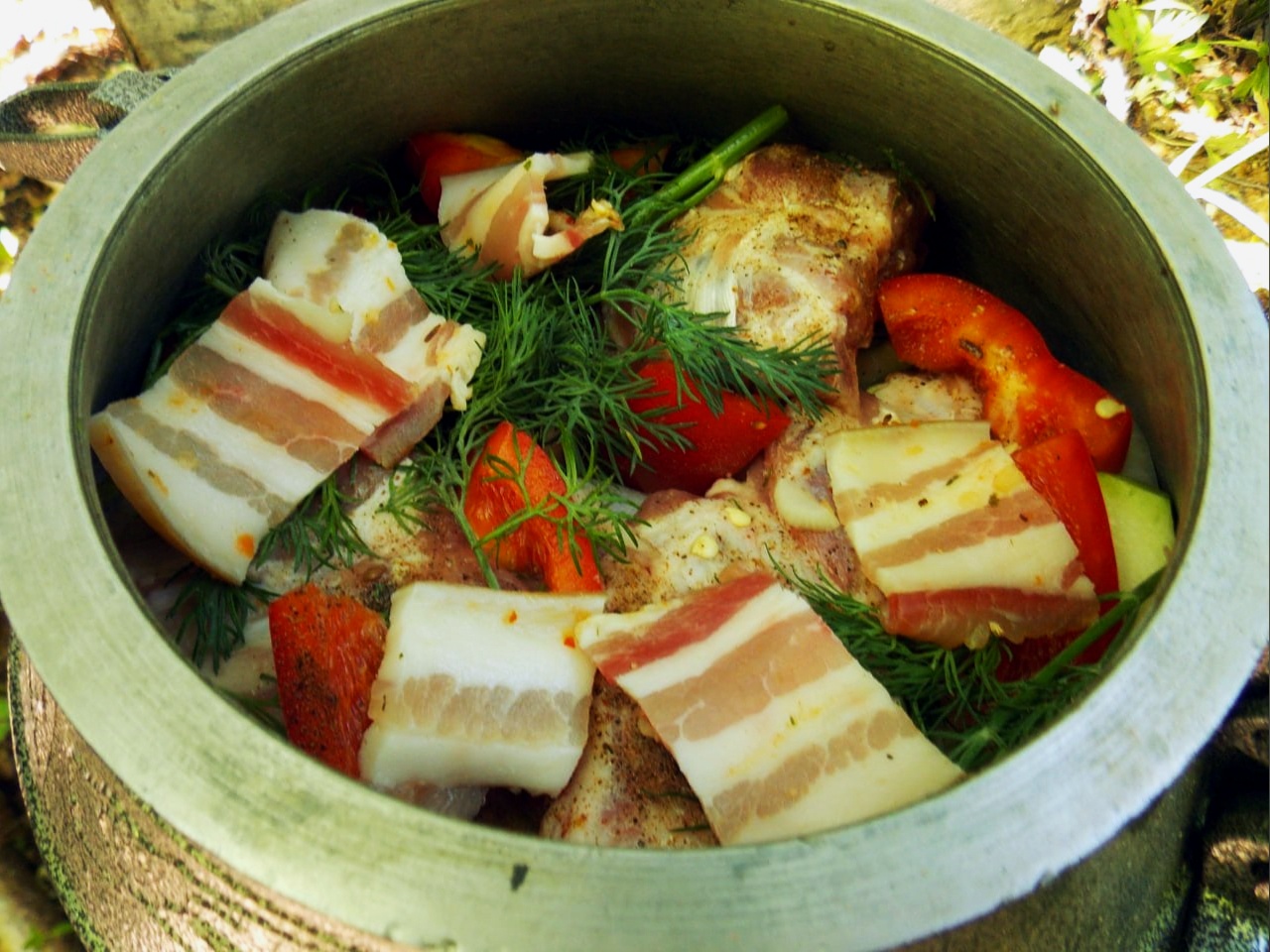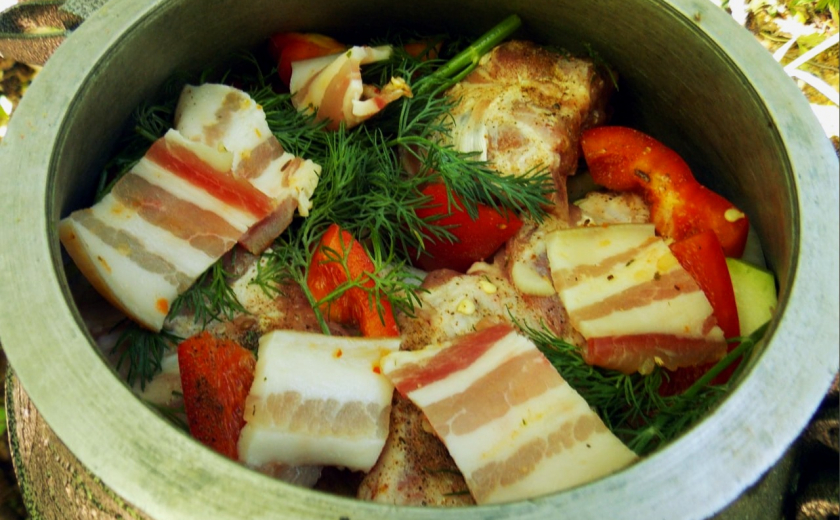 Для приготовления этого блюда на костре подойдет афганский казан. Рульку, ребра, сало и овощи нужно нарезать и положить в него, залить водой и оставить томиться. Туда же отправляется зелень и специи. Пока импровизированное рагу готовится, тщательно помойте оставшийся картофель [или весь, если вы решили его не добавлять в первое блюдо], сделайте несколько вертикальных надрезов, положите в них сало. Затем оберните каждый клубень фольгой и отправьте запекаться.