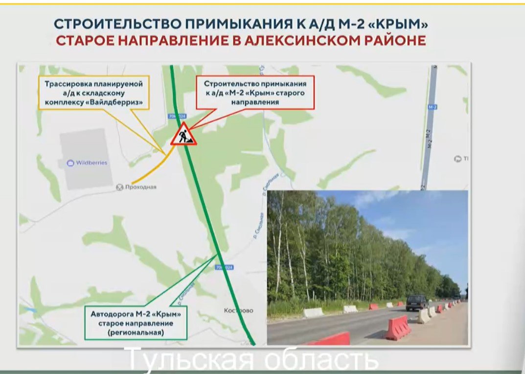 Зампред правительства Родион Дудник доложил, что дорогу строит Wildberries. Это примыкание от склада маркетплейса к старому направлению трассы М-2 «Крым».