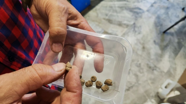 Далее он показывает подвески от ожерелья: их, по словам реставратора, отливали в цельной форме.