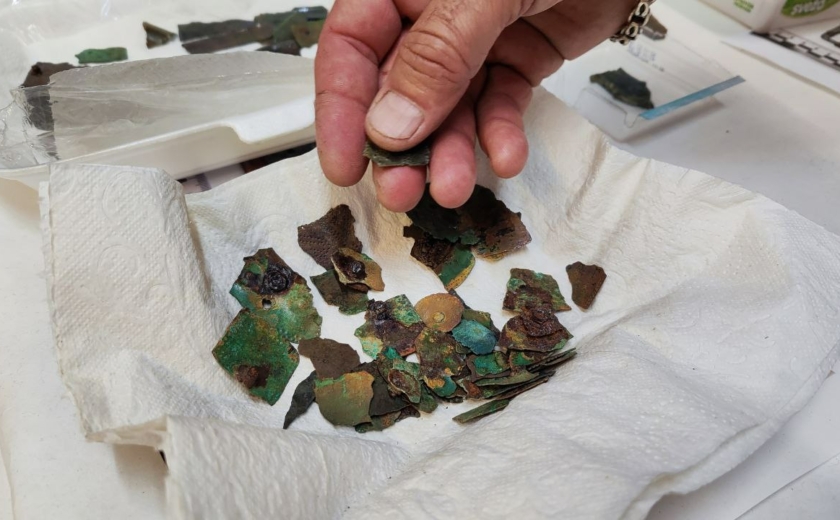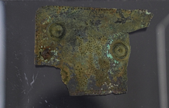 Сохранились и фрагменты кожаных ремней, на них видны отверстия от клепок — редчайшая, по словам специалистов, находка (обычно органика не сохраняется). Здесь кожу, скорее всего телячью, «законсервировали» бронзовые пластины. Для лучшей сохранности сейчас эти фрагменты находятся в специальном растворе и обязательно — в холоде.