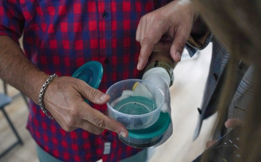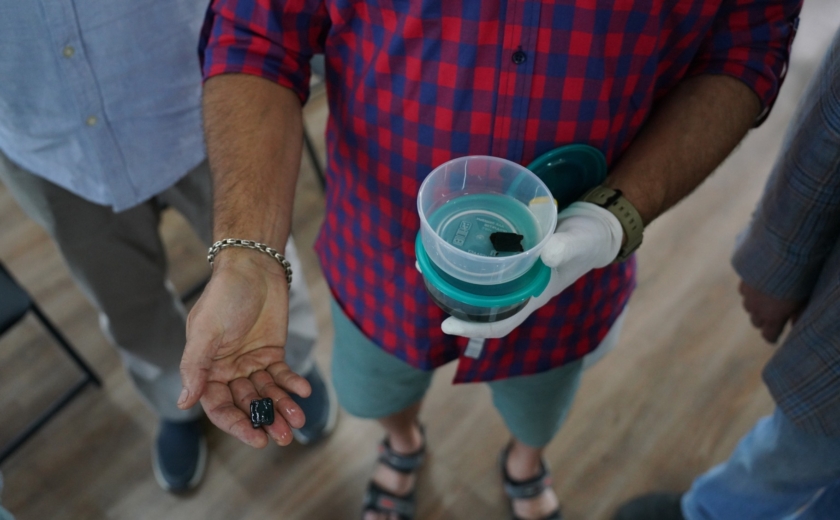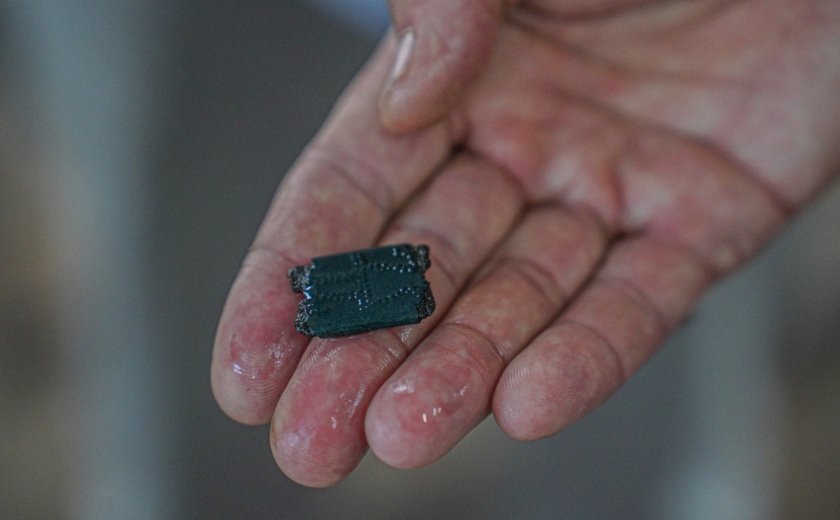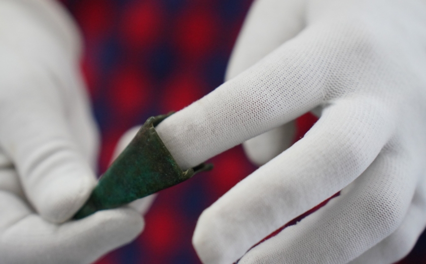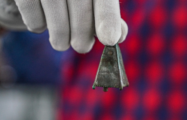 «Колокольчик сделан из двух металлов. Обычно язычки прикипают [к стенкам] или разрушаются. Нам повезло — образовалась коррозия, которую мы аккуратно удалили. Теперь мы слышим звон. Эта вещь могла быть на одежде или на косе», — размышляет Виталий Шмелев.