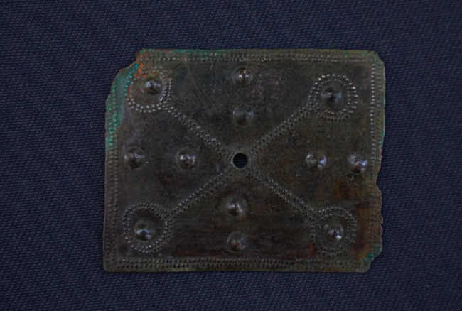 Особый интерес представляют тонкие бронзовые пластины, украшавшие пояса. Крепились они к кускам кожи. На пластинах можно рассмотреть орнаменты: археологи уверены, что делали их разные мастера. Где-то это просто «точки-полоски», а где-то — схематичные изображения человека или животного.