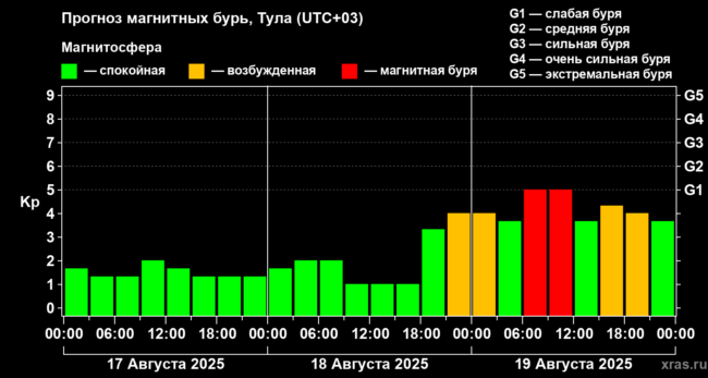 Магнитные бури уровня G1 считаются самыми слабыми, уровень G3 — сильная буря, которая вызывает перебои в спутниковой навигации и радиосвязи.