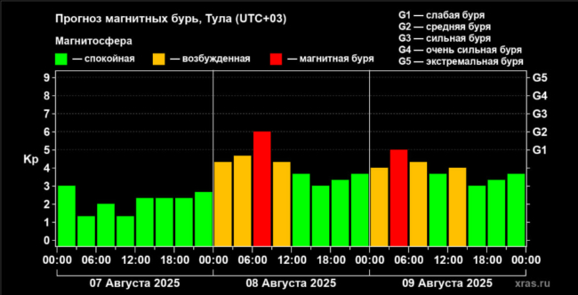 Магнитные бури уровня G1 считаются самыми слабыми, уровень G3 — сильная буря, которая вызывает перебои в спутниковой навигации и радиосвязи.