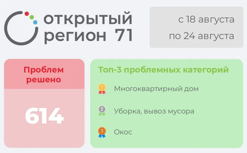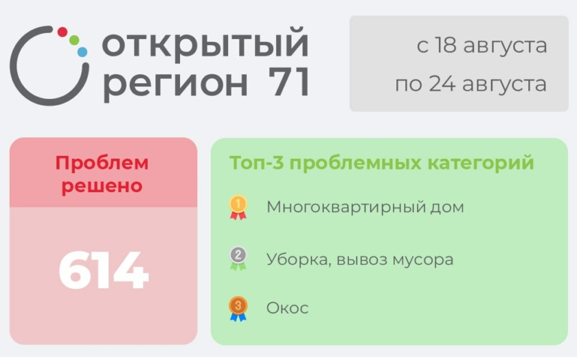С 18 по 24 августа на региональном портале «Открытый регион 71» зафиксировано и решено 614 обращений от туляков. Большинство из них — по теме обслуживания многоквартирных домов: уборка дворов, вывоз мусора, благоустройство территорий.