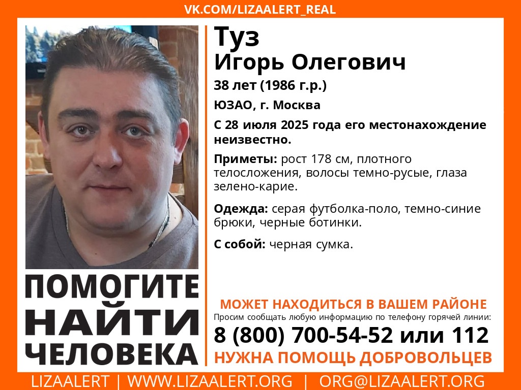 С 28 июля ведутся поиски жителя Москвы Игоря Туза. В том числе, как сообщает поисковый отряд «ЛизаАлерт», 38-летний мужчина может находиться в Новомосковске.