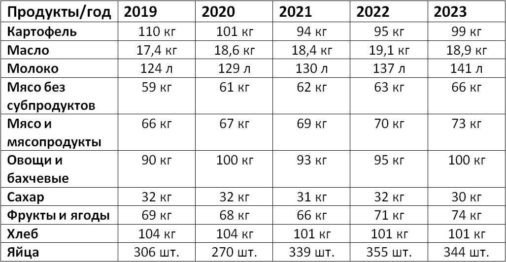 За год же немного другая статистика. В 2023 году по сравнению с 2022 годом туляки сократили потребление масла, яиц и сахара. Статистика берется на душу населения. Так, в предыдущем году один туляк съедал 344 яйца, а годом ранее — 355 штук. Потребление сахара сократилось на 2 кг (с 32 до 30), а масла — на 1,8 кг (с 19,1 до 18,9).