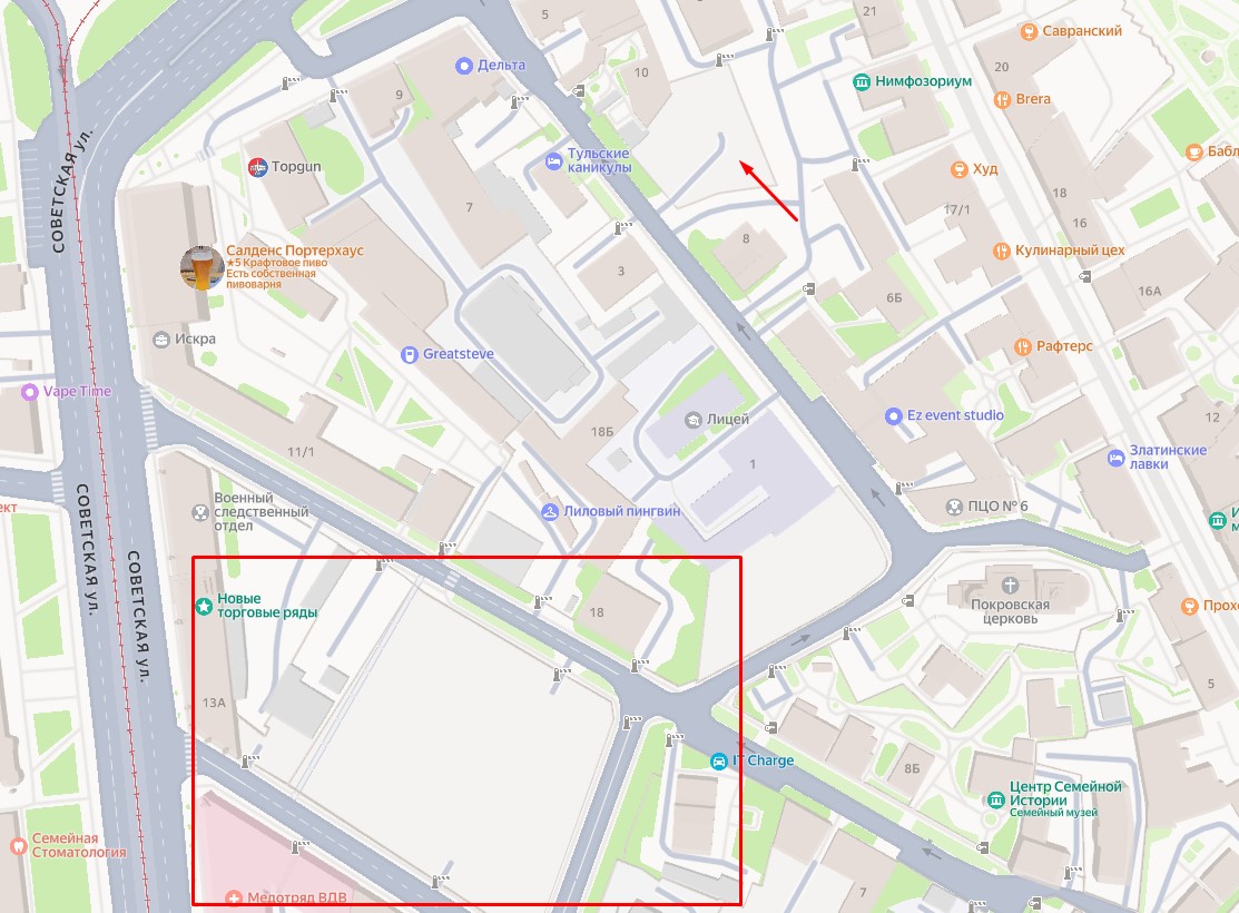 Сейчас Черниковский переулок застроен с обеих сторон. Тут уже есть две гостиницы: «Черниковский» и «Тульские каникулы». Свободный участок можно увидеть рядом с домом № 8 (обозначен стрелкой). По нему даже проводились публичные слушания. Правда, чтобы разрешить строительство парковки. Стоянку для своих нужд хотело оборудовать ООО «Фьюри».