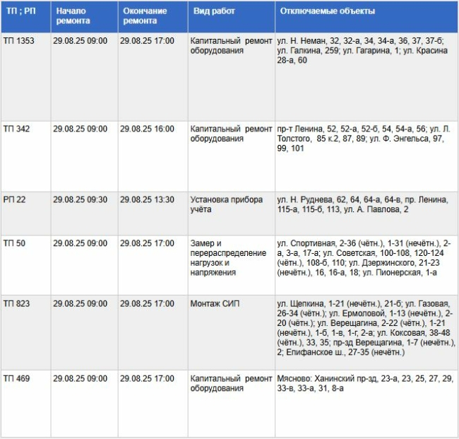 Практически все отключения начнутся с 9:00 и продлятся до 17:00. Более подробная информация об отключениях и адресах — в таблице: