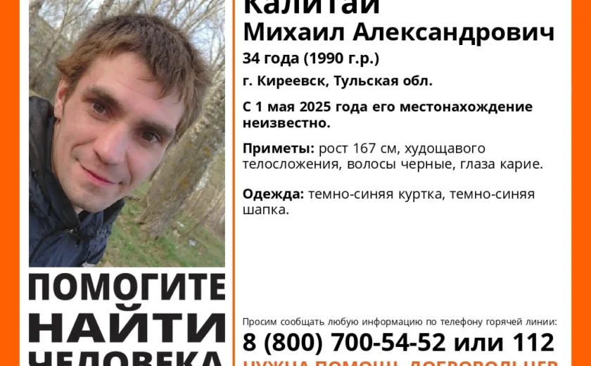 Волонтеры поискового отряда «ЛизаАлерт» разыскивают 34-летнего Михаила Александровича Калитая из Киреевска. Местонахождение мужчины неизвестно с 1 мая 2025 года.