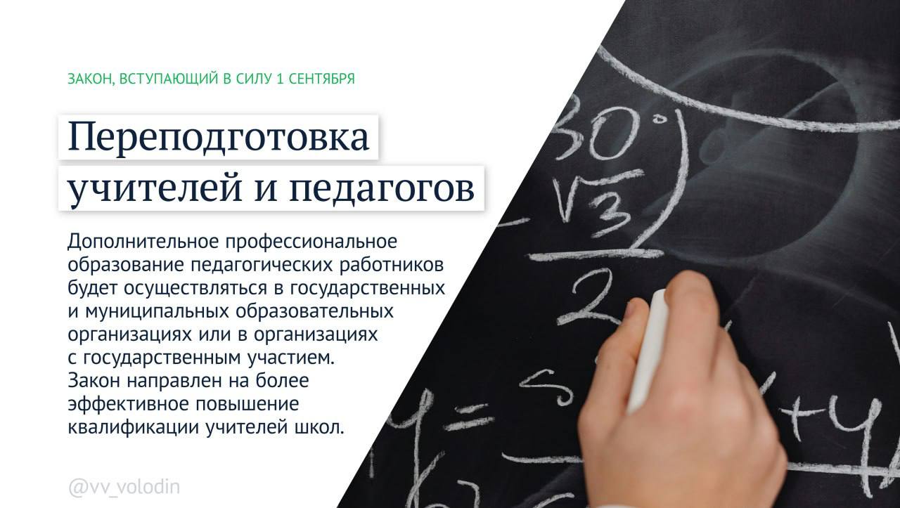 Теперь переподготовка педагогов будет проходить только в государственных и муниципальных образовательных организациях или организациях с государственным участием. Закон направлен на эффективное повышение квалификации учителей.