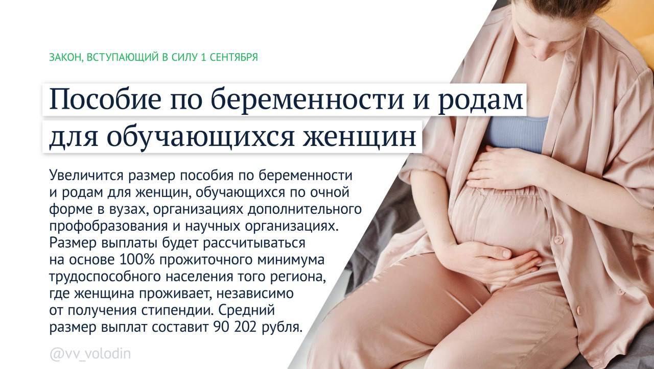 Закон вступит в силу с 1 сентября. Размер пособия по беременности и родам для студенток вырастет. Мера поддержки распространяется на тех, кто учится очно в вузах, учреждениях дополнительного профильного образования и научных организациях.