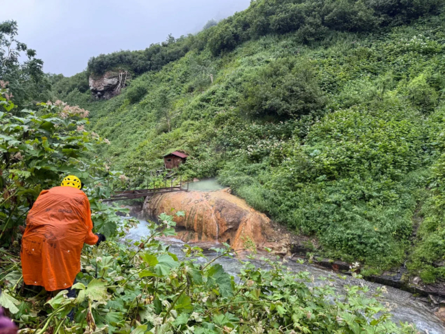 Конечно, на медвежей тропе мы принимаем меры безопасности на тот случай, если вдруг медведь высунет морду из шеломайника (высокая трава, которую часто можно встретить на Камчатке — прим. ред.). А он высунет морду, увидит, что там люди, и уйдет обратно. Мы на это расчитывали и наши расчеты оправдались.