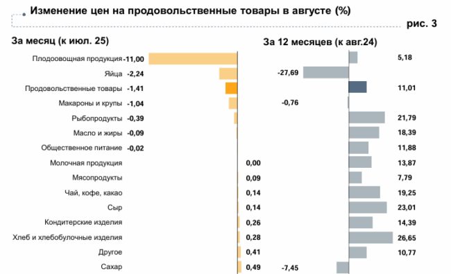 Снизились цены на картофель, морковь, капусту, лук из-за отечественного урожая. Яйца продолжают дешеветь: на 27,69% с февраля — это самый высокий показатель. При этом цены на услуги выросли. На непродовольственные товары цены также поднялись, но за год прирост меньше, чем на продовольствие. Так, например, подорожала косметика и парфюмерия из-за увеличения затрат на сырье, материалы, логистику. За год показатель прироста увеличился на 10,02%.