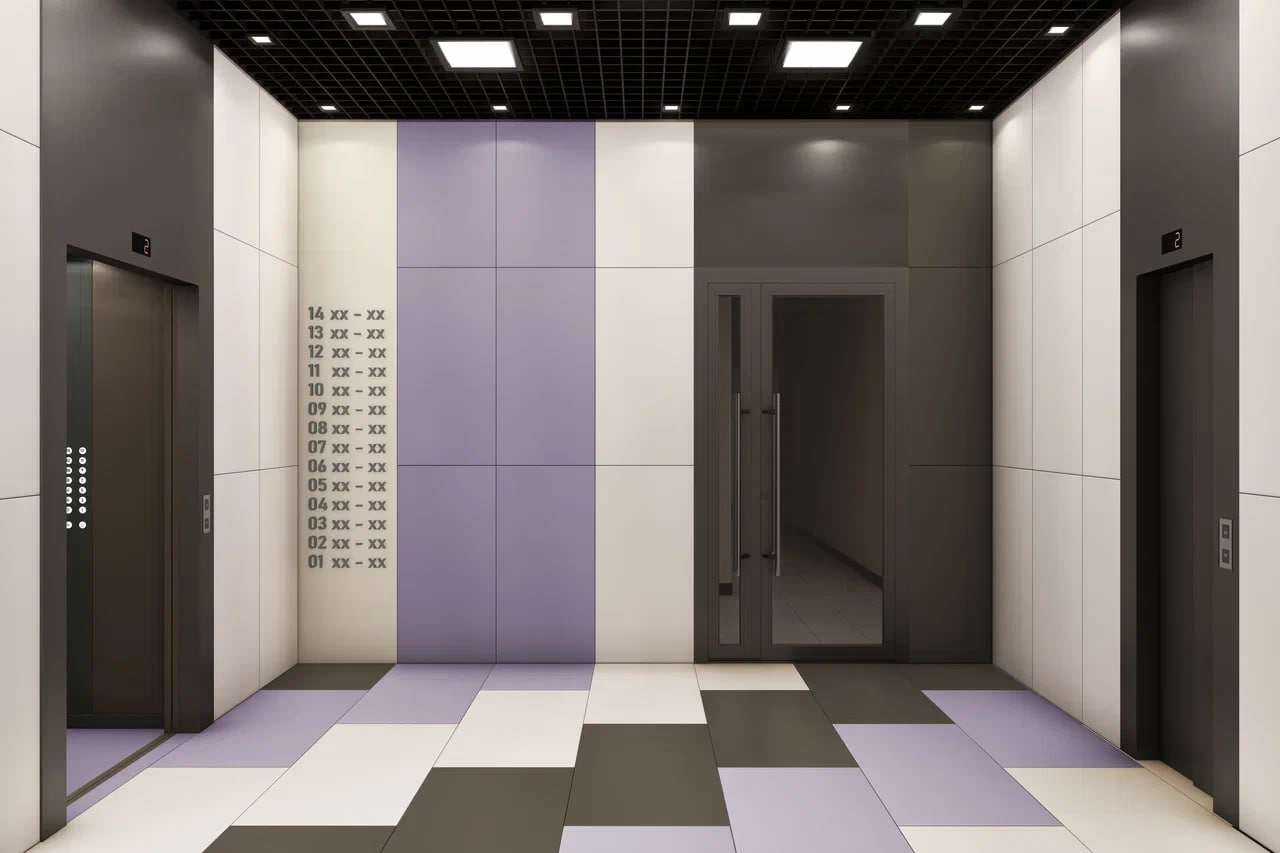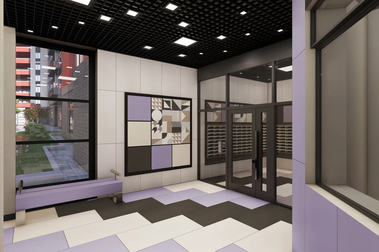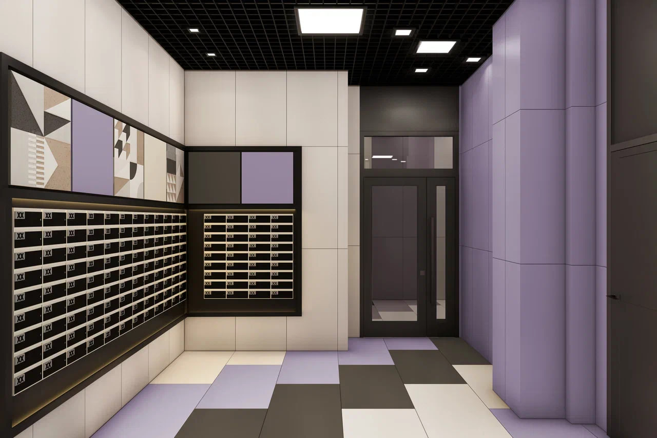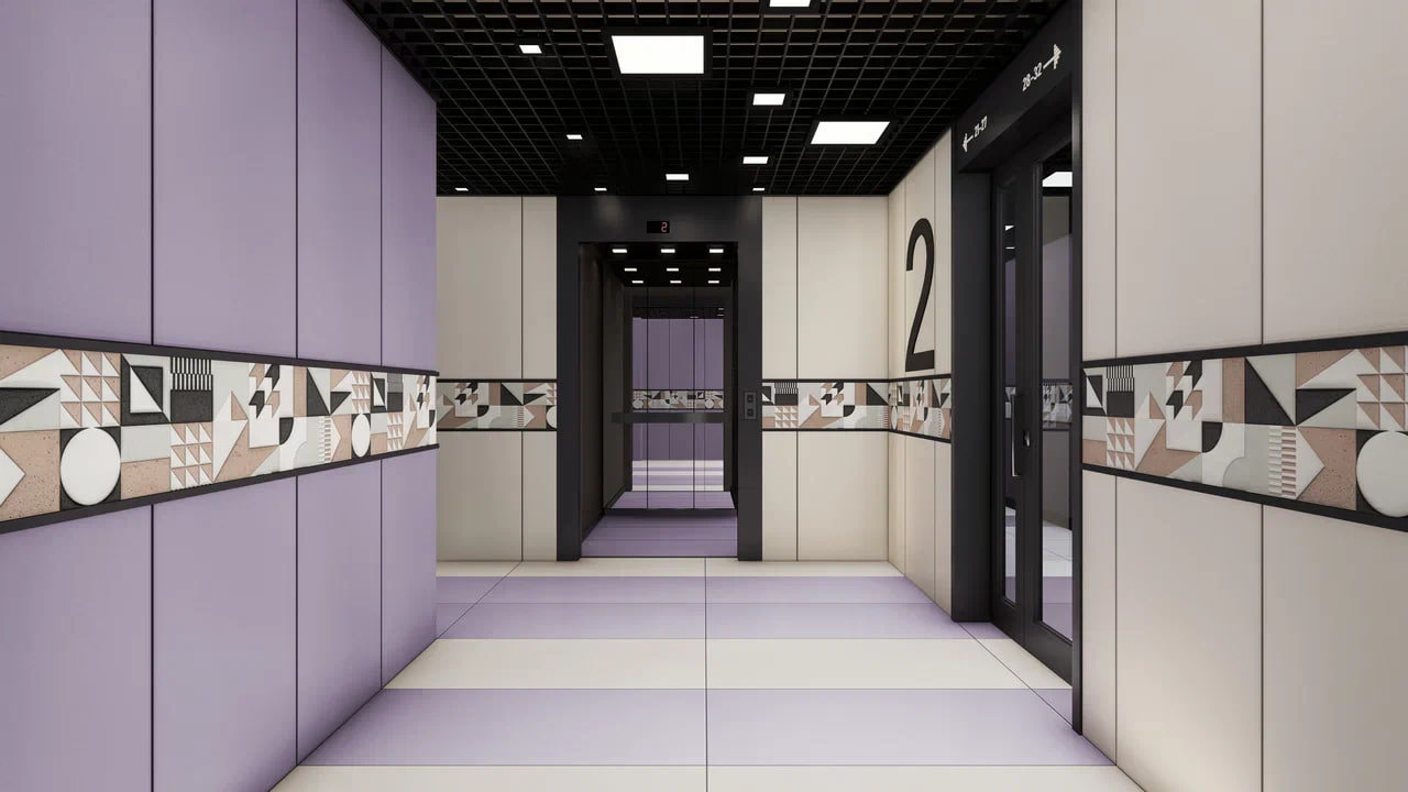 Кроме того, в новом доме № 30 застройщик вдохнул в дизайн мест общего пользования свежую идею. Благодаря акценту на трех пастельных цветах: сиреневом, сине-сером и зеленом, получился уникальный и сбалансированный стиль.