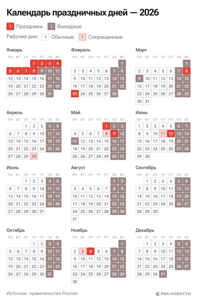 Председатель Правительства РФ Михаил Мишустин подписал постановление о праздничных и выходных днях на 2026 год.