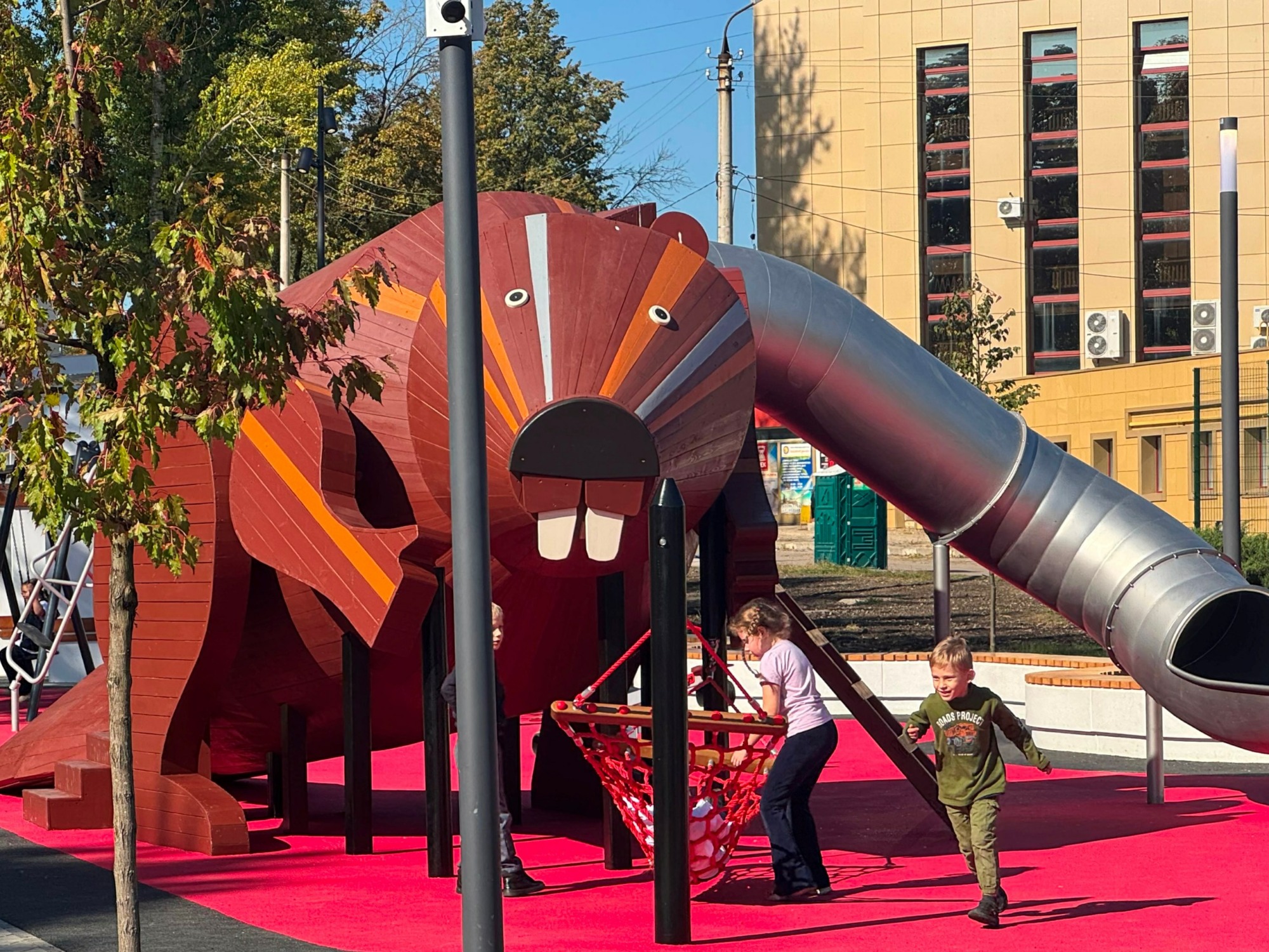 Сквер разделен на зоны для активного и спокойного отдыха. Здесь появились качели под навесом, современные детские и спортивные площадки, памп-трек. Особое внимание привлекает символ города — большая фигура бобра, напоминающая о старом названии Новомосковска — Бобрики.