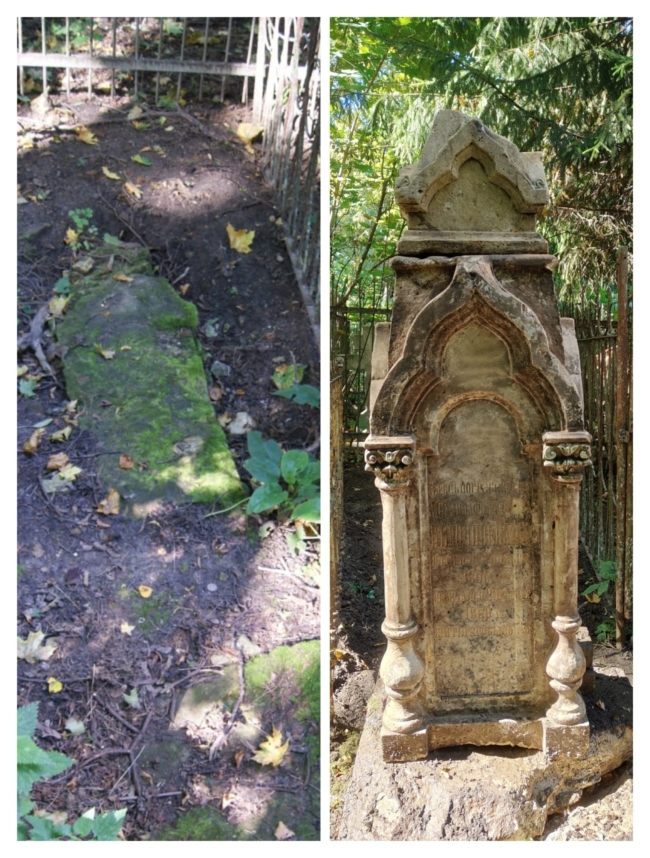Надгробие в форме часовенки было опрокинуто и заросло мхом. Добровольцы смогли извлечь его из земли, установить на место и очистить. На камне сохранились следы старой краски — черной, зеленой и золотой.
