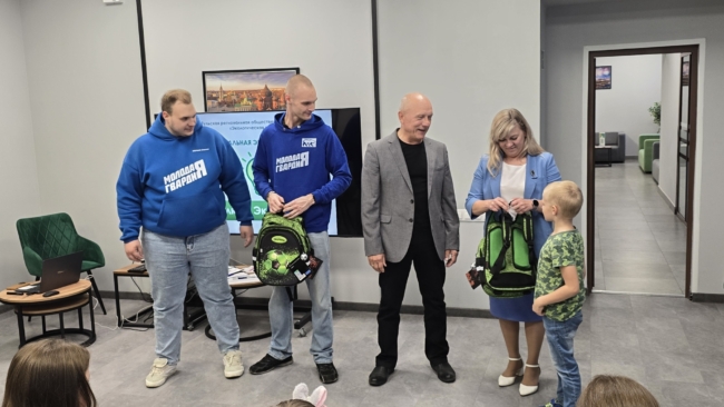 Но перед квизом – приятные и полезные подарки для каждого. Дело в том, что в зале собрались первоклассники. Чтобы они приносили в дневниках одни пятерки, активисты «Молодой Гвардии» в рамках акции «Собери ребенка в школу» подготовили для ребят рюкзаки, ручки, карандаши, тетради и все то, что будет полезно в первый учебный год.