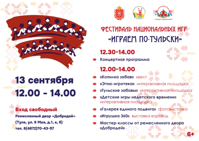 13 сентября в рамках XIX Межрегионального фестиваля национальных культур «Страна в миниатюре» в Туле состоится фестиваль национальных игр. Мероприятие пройдет в ремесленном дворе «Добродей» (ул. 9 Мая, 1а) и продлится с 12:00 до 14:00.