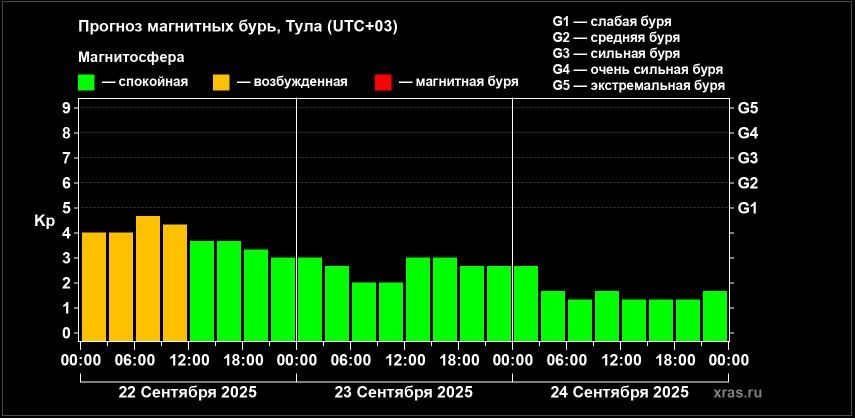 В понедельник, 22 сентября, в Туле ожидаются небольшие колебания магнитосферы. Такой прогноз опубликовала лаборатория солнечной астрономии ИКИ и ИСЗФ. До слабой магнитной бури колебания не доберутся, но будут в непосредственной близости от нее. Вероятность наступления магнитной бури составляет 51%.