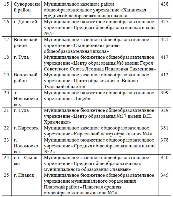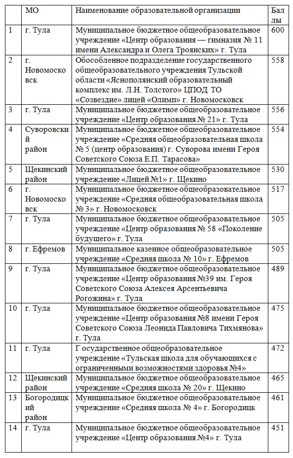 На первом месте учитель из тульской гимназии №11, который набрал больше всего баллов по итогу конкурсного отбора — 600! С отставанием всего в 42 балла второе место занимает педагог из Новомосковска, который трудится в «Яснополянском образовательном комплексе им. Л.Н. Толстого» ЦПОД ТО «Созвездие» лицей «Олимп». Подробнее — смотрите в таблице: