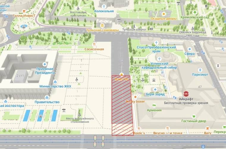 Зато участок от флага до улицы Менделеевской останется открытым. Въезд и выезд с площади возможны только с улицы Менделеевской.