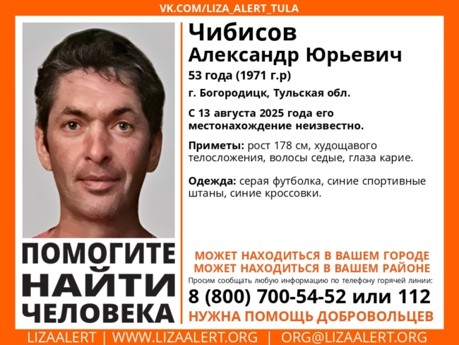 Поисковый отряд «ЛизаАлерт» разыскивает 53-летнего Александра Юрьевича Чибисова из Богородицка. Мужчина пропал 13 августа: его местонахождение до сих пор неизвестно.